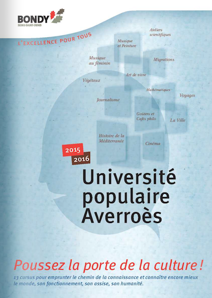 L’Université Populaire Averroès présente toute l’année, depuis 2009, des enseignements de haut niveau, gratuits et accessibles à tous. L’édition 2015-2016 était présidée par la philosophe Sylviane Agacinski. Des sujets aussi divers que l’histoire des mathématiques, les plantes, l’histoire de l’art de vivre y sont abordés. Laissez-vous tenter ! (illustration copyright Mairie de Bondy).